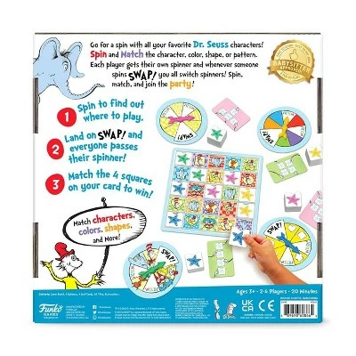 Go for a spin with your favorite Dr. Seuss characters! Spin and Match the character, color, shape, or pattern. Each player gets their own spinner and whenever someone spins SWAP! you all switch spinners. Spin, match, and join the party!